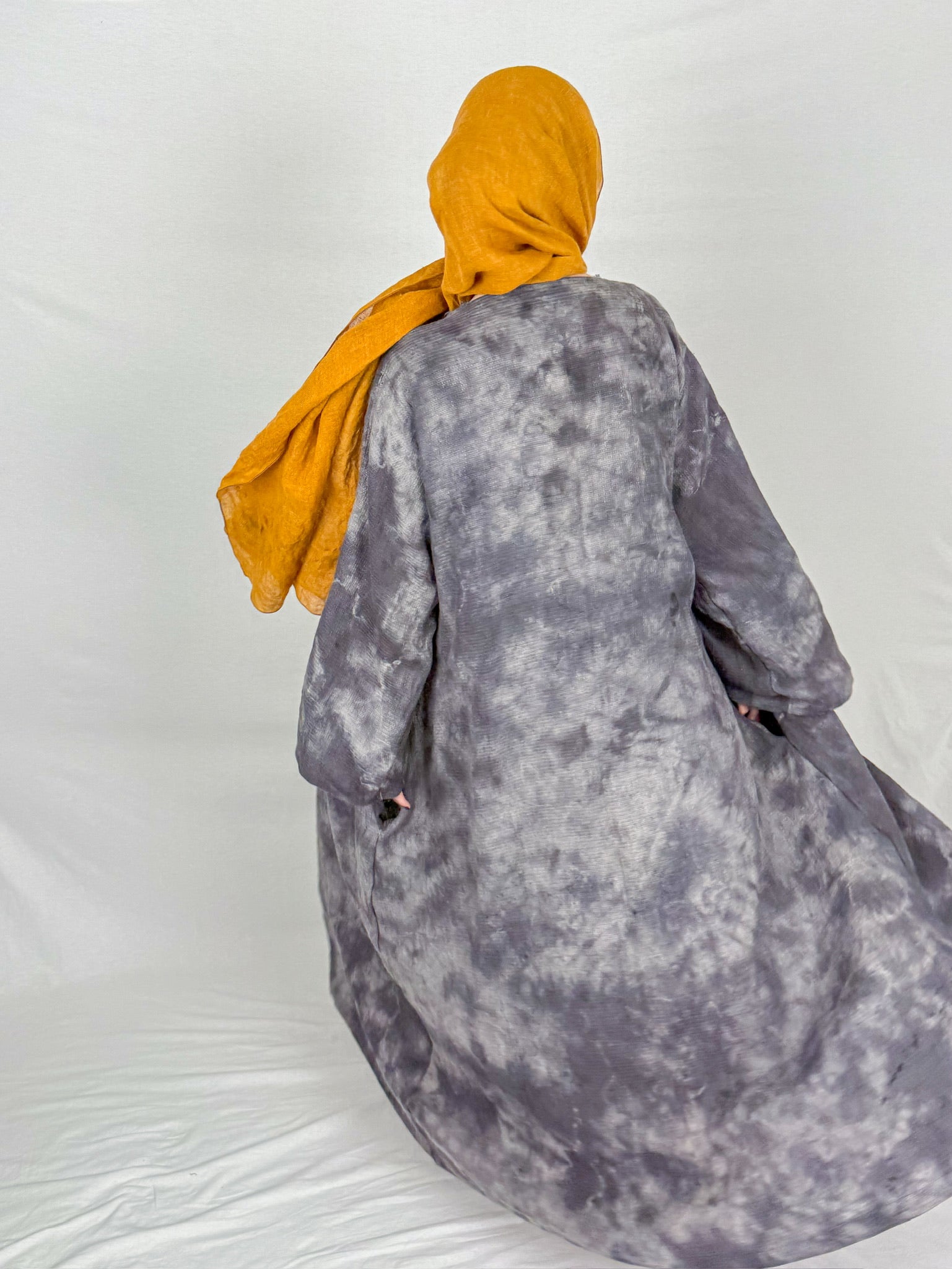The Stargazer Duster captures the essence of the desert night skies, reflecting the mysterious beauty of twilight above the sands. Dyed with logwood and iron, this piece features a scrunch-dye technique that creates a striking black-gray pattern, reminiscent of shadowy horizons and star-streaked skies.