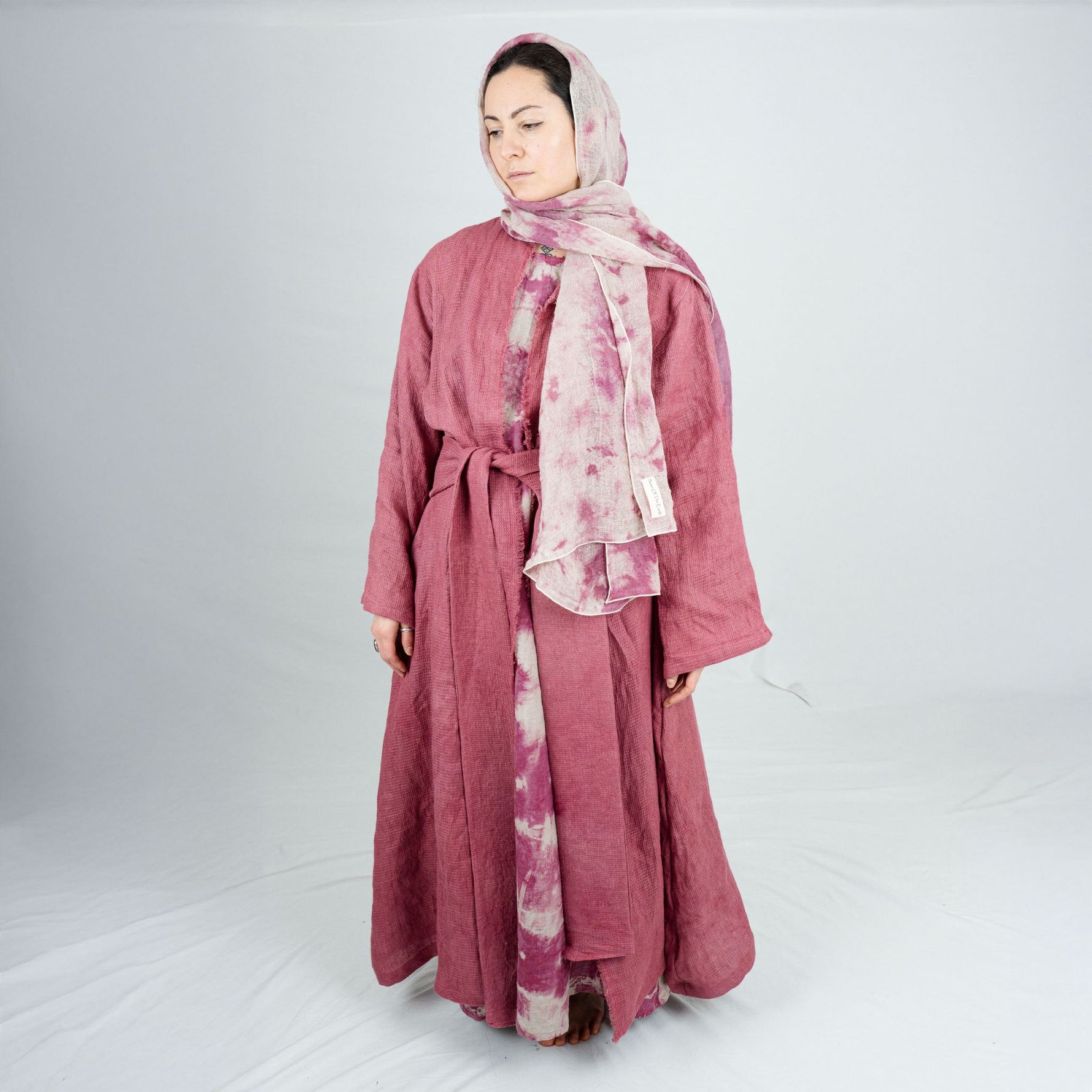 The Twilight Duster captures the deep, shifting colors of desert sunsets, blending hues of rich warmth and subtle transitions. Hand-dyed with lac, enhanced by the exhaust baths of camwood and rhatany root, this piece evokes the tranquil beauty of twilight as day melts into night.