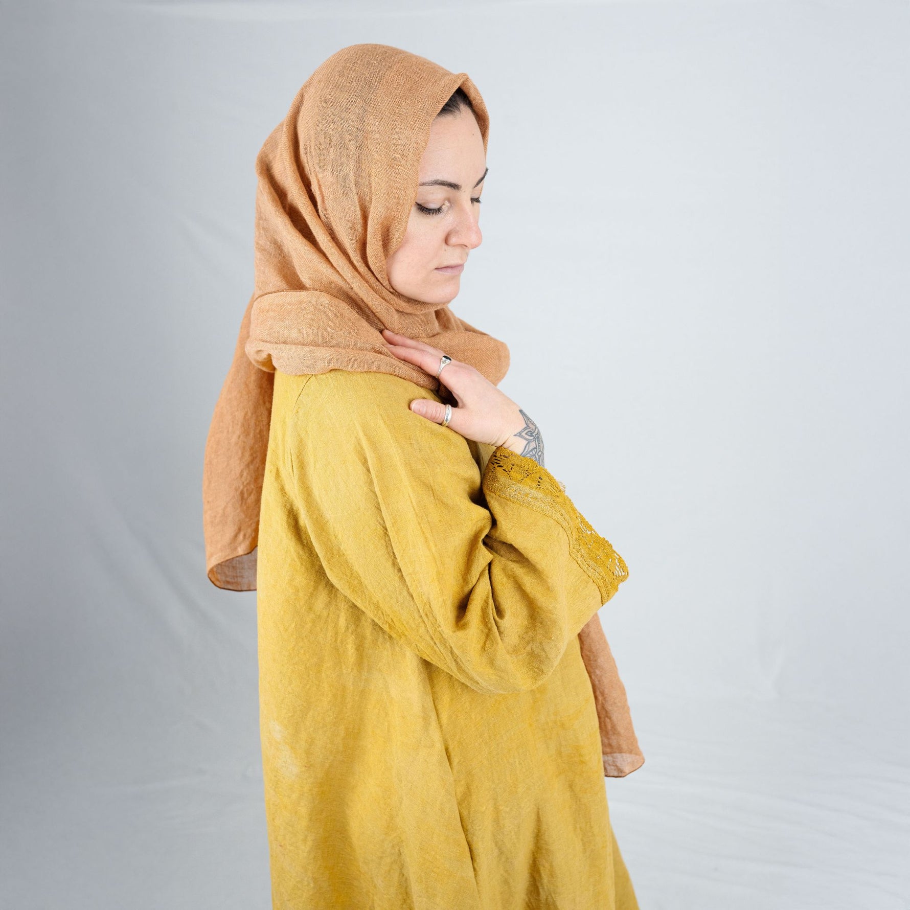The Blossom Dune Veil combines the warmth of desert sands with the soft, blooming energy of nature, inspired by the beauty of a desert in bloom. Hand-dyed with the rare and vibrant camwood, this Shayla-style hijab or scarf embodies a rich, warm hue that feels both grounding and uplifting.
