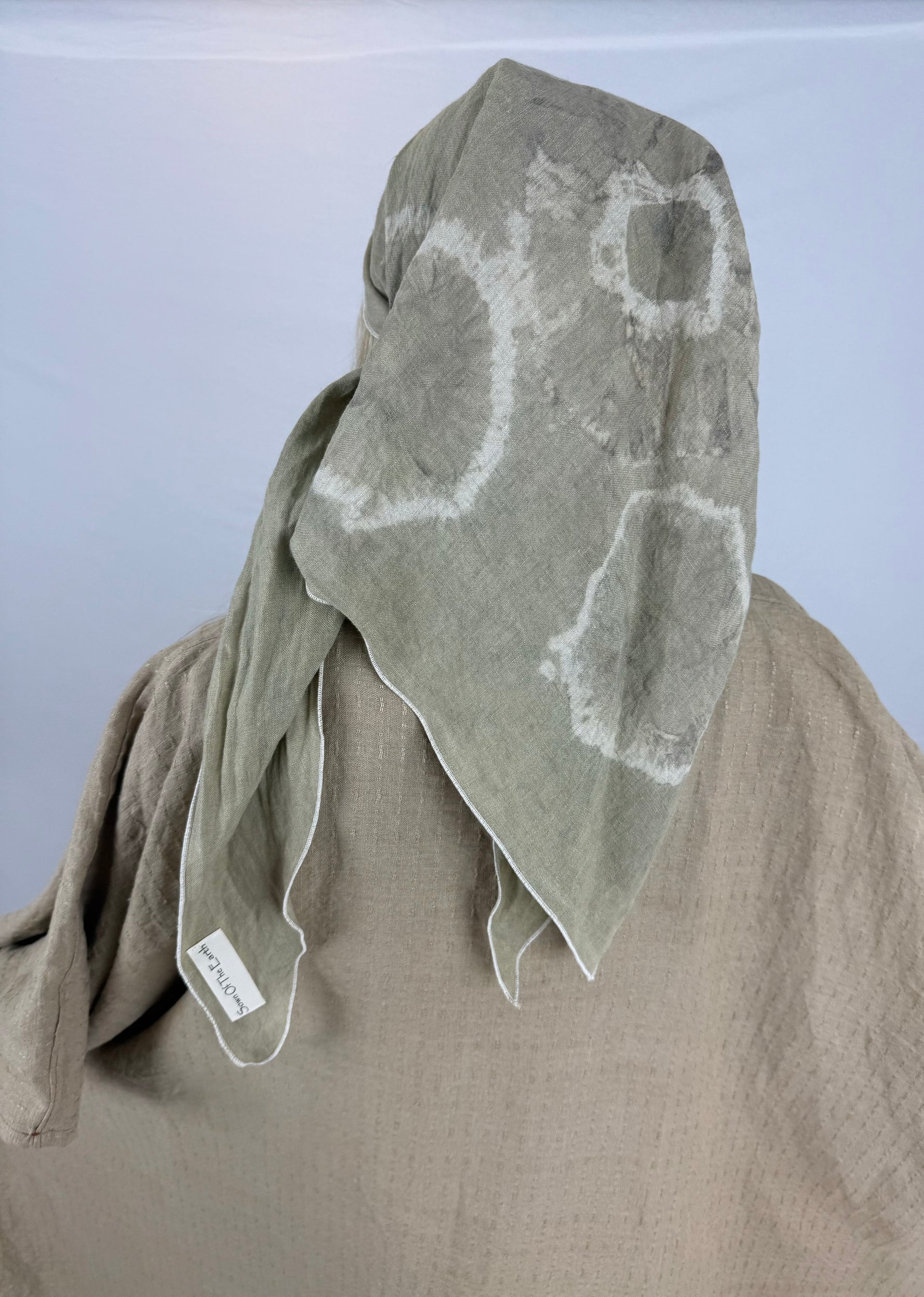 Hand-dyed with natural pomegranate and dipped in iron, it boasts a stunning olive green hue reminiscent of lush olive groves. The delicate shibori design adds an artistic touch, creating a piece that is both elegant and unique.