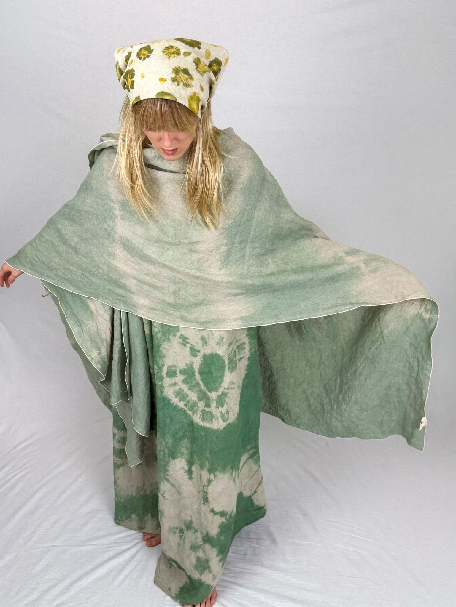 The Cactus Bloom Wrap Shawl captures the vibrant energy of desert cacti, thriving with life and beauty in the arid climate. Naturally dyed with mulberry, this shawl showcases a lively green hue with a subtle shibori design, reflecting the intricate artistry of nature.