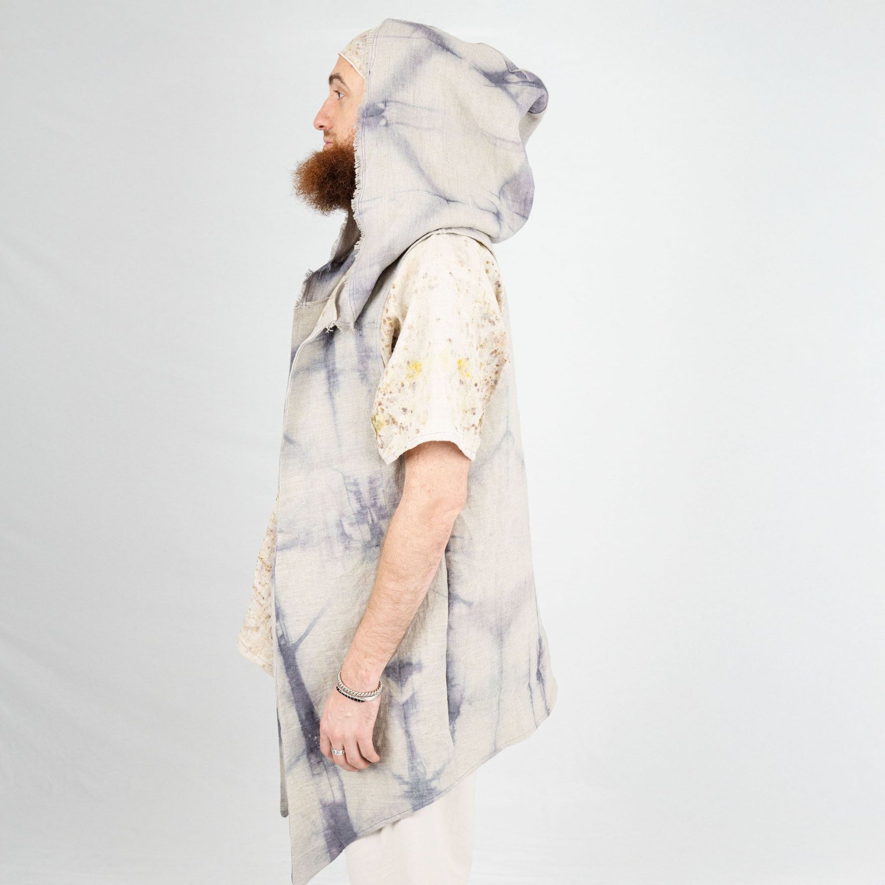 The Mystic Sands Vest evokes the mysterious and tranquil beauty of shifting desert sands at dusk. Hand-dyed with logwood and iron, this piece is further enriched with the subtle hues of blue gardenia and lac dye, resulting in a deep purple tone with a soft gray base. Its mesmerizing shibori design reflects the calming and ever-changing patterns of nature.